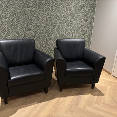 Nojatuolit, joissa vihreä keinonahkaverhoilu ja ruudutettu istuin- ja selkänoja. Tuoleissa on puiset jalat ja runko. Verhoilussa sekä puuosissa on näkyvissä kulumaa ja joitakin jälkiä, jotka kannattaa huomioida. Sopivat esimerkiksi olohuoneeseen tai työhuoneeseen istuimiksi.