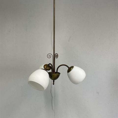 Vintage Sievä Oy kattovalaisin. Kolme valopistettä opaalilasi varjostimilla, patinoitunut messinkinen runko.