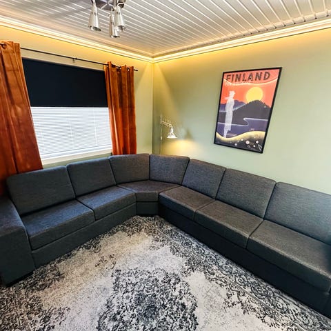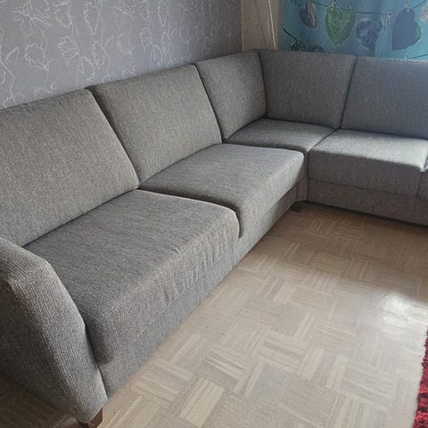 VARATTU Iso harmaanbeige kulmasohva. Erittäin mukava istua. Jouset ovat hieman antaneet periksi toisesta kulmasta, ei ole haitannut käyttöä. Istuinosien päälliset ovat irrotettavat ja ne pystyy pesemään koneessa. Muiden osien pesu onnistuu pesurilla. Pesulla tästä saa vielä hyvän sohvan. Yhdessä kulmassa kulumaa (kuva). Koiratalous.