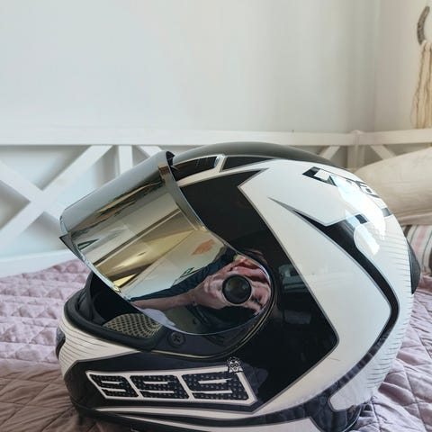 Marushin umpikypärä moottoripyöräkäyttöön. Kypärä on väriltään valkoinen, jossa on mustia ja harmaita kuvioita. Kirkas visiiri suojaa ajoviimalta ja roiskeilta. Sisäosat ovat pehmustetut ja hengittävät, ja leukahihnassa on lukitusmekanismi. Soveltuu moottoripyöräilyyn ja muuhun moottoroituun ajoneuvokäyttöön, jossa vaaditaan kokokasvokypärää.Koko XS.