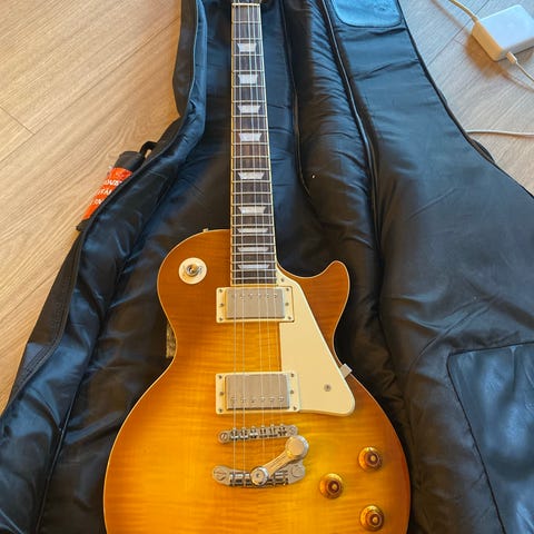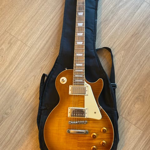 Les Paul -tyylinen Kisai single cut -sähkökitara sunburst-värityksellä. Kitarassa kaksi humbucker-mikrofonia, kolmiasentoinen mikkivalitsin, kaksi volume- ja kaksi tone-säädintä sekä kiinteä talla. Otelaudassa lohkoinlayt ja 22 nauhaa. Ostettu Verkkokaupasta 3.1.2026, eli takuuta reilusti jäljellä. Tehdaskielet edelleen kiinni. Ovh 199,99€.