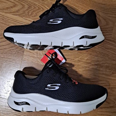 Skechers tennarit, koko 36. Väriltään mustat valkoisella pohjalla. Nauhallinen malli; nauhat vain koristeena, jossa pehmustettu sisäpohja. Sopivat arkikäyttöön ja kevyeen ulkoiluun. Slip in, eli helpot laittaa jalkaan, vähän käytetyt viime kesänä hankitut.