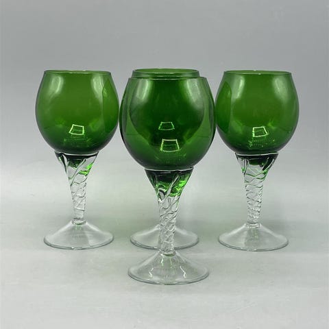 Neljä vihreää retrotyylistä viinilasia, joissa on kierretty jalka.