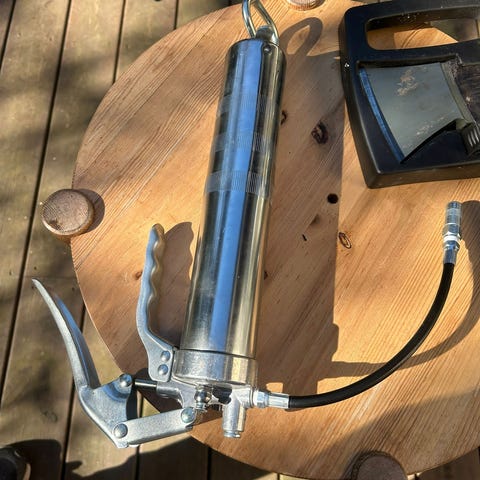 Vanha iso toimiva rasvaprässi. Täytetty vihreällä vaseliinilla.