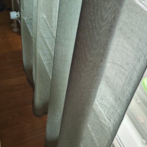 Ellos verhot harmaa raidallinen. Verhoissa on vaakaraitakuosi eri vihreän sävyissä. Sopivat käytettäväksi esimerkiksi olohuoneessa tai makuuhuoneessa ikkunaverhoina. Materiaali ei käy ilmi, mutta pinta on kevyesti kiiltävä ja laskeutuva.