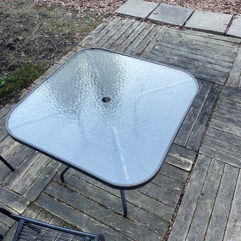 Neliönmuotoinen terassipöytä, jossa on valkoinen runko ja lasinen pöytätaso. Rungon materiaali on metallia ja kansi on lasia. Pöydän pinnassa ja rungossa käytön jälkiä, jotka näkyvät lähikuvissa. Lasi ehjä. Mitat 90x90, korkeus 74.