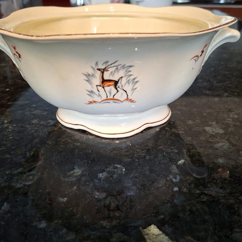 Myynnissä on selkeälinjainen ja klassinen Arabian Sinivalko-sarjan tarjoilukulho, jonka on suunnitellut Kurt Ekholm. Kulhossa on sille ominainen, leveä sininen raita valkoisella pohjalla. Pohjasta löytyvä kruunuleima ajoittaa esineen valmistuksen vuosien 1949–1964 välille. Kulhon halkaisija on 22 cm (ilman korvia) ja korkeus noin 10 cm, mikä tekee siitä erinomaisen kokoisen esimerkiksi salaatti- tai perunakulhoksi.