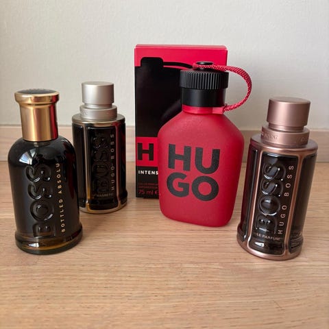 Hugo Boss -hajuvedet miehille. Kuvassa kaksi eri Boss 100ml -tuoksua alkuperäisissä pulloissa ja pakkauksissa. Myydään yhdessä 40€ hintaan tai erikseen 25€/kpl.