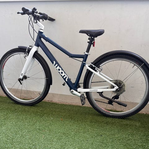 Woom Original 2 -lasten ensipyörä 14" renkailla, sininen. Lisävarusteina seisontajalka ja ketjusuoja. Ovh. 470€.