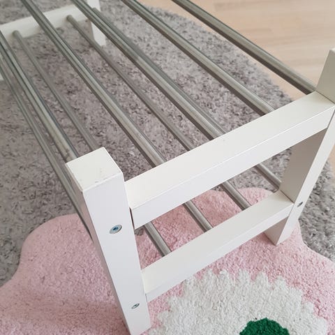Metallinen kestävä.Kenkäteline,Harmaa.ejjä,siisti.vähäisellä käytöllä ollut.pituus 90 cm,leveys 30 cm.