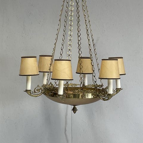 Empire tyylinen kattovalaisin, jossa on kuusi valopistettä ja koristeelliset varjostimet. Valaisimen runko on koristeltu yksityiskohtaisilla metallielementeillä.