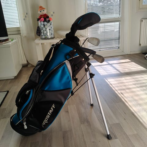 Lasten golf mailat ja bägi. Tarpeettomana pois varastosta. Kuvassa kaikki oleellinen. En ole mitannut. Nouto Laukkavuoresta.