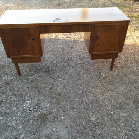 Myydään tarpeettomana kuvanmukainen kirjoituspöytä 50-luvun talon vintistä. Etuosassa kaareva muotoilu. Keskimmäisestä laatikosta puuttuu pohjalevy, kts. Toinen kuva.
