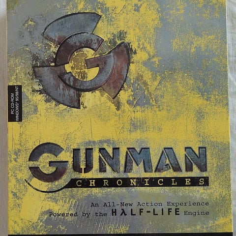 Sierra Gunman Chronicles PC Big Box -peli. Ensimmäisen persoonan toiminta- ja räiskintäpeli, joka käyttää Half-Life -pelimoottoria. Myyntipakkauksessa näkyy alkuperäinen laatikko ja pelin levyt sekä mukana tulevat painetut materiaalit. Peli on tarkoitettu pelattavaksi PC-tietokoneella, ja se sijoittuu scifi-teemaiseen ympäristöön avaruudessa.