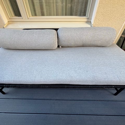 Myydään kuvanmukainen itsetehty daybed parvekkeelle. Todella tukeva (ja melko painava). Ollut lasitetulla parvekkeella. Kaupanpäälle saa halutessaan siistikuntoisen talven lasitetulla parvekkeella olleen patjan sekä 90 asteessa pestyn patjansuojuksen ja kuvassa näkyvän päiväpeiton, jota käytetty patjan ympärillä.