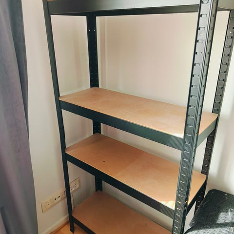 Puinen hyllykkö.
