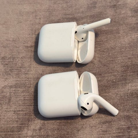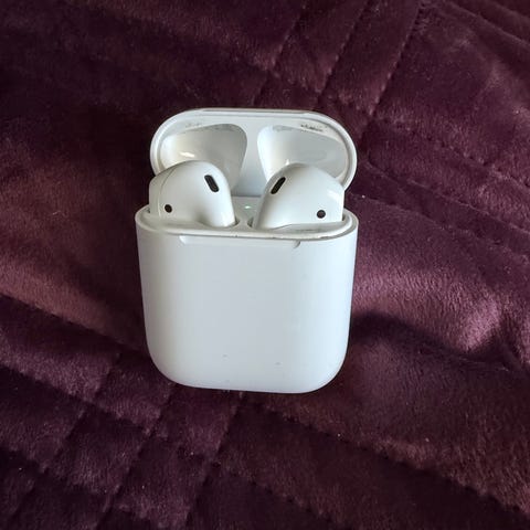 Apple langattomat nappikuulokkeet valkoisena latauskotelolla. Kuulokkeet ovat in-ear-tyyppiset ja tulevat kovamuovisessa kotelossa, joka suojaa kuulokkeita kuljetuksen aikana. Sopivat yleiseen musiikin kuunteluun, puheluihin ja muuhun arjen käyttöön yhteensopivien laitteiden kanssa.