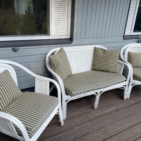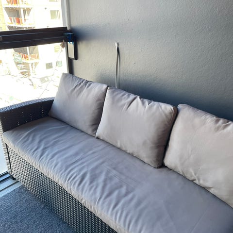 Parvekekalusteryhmä, johon kuuluu kaksipaikkainen sohva, kaksi tuolia ja pöytä. Runko on metallia ja istuinosat sekä selkänojat harmaata verkkokangasta. Pöydässä on lasikansi. Koot näkyy kuvissa.