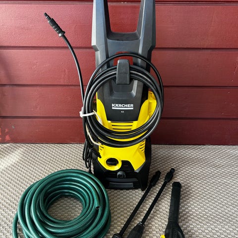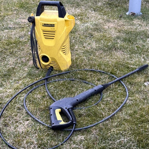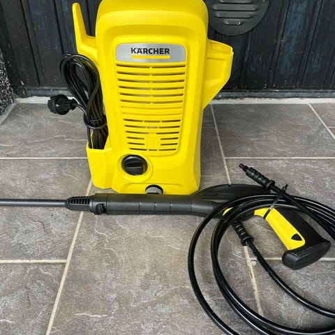 Kärcher K 2.91 painepesuri keltainen. Sähkökäyttöinen painepesuri, jossa on kantokahva ja pyörät siirtämistä varten. Mukana pesukahva, suutinvarsi ja pyörivä terassipesuri-/pintapesuriosa. Soveltuu esimerkiksi pihan kivipintojen, terassin ja auton pesuun, sekä muiden ulkopintojen pesuun. Ikää reilu 10 vuotta, mutta toimii.