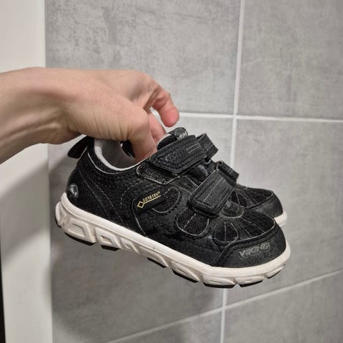Viking lasten kengät, koko 23. Huom tarrat eivät pidä kunnolla, olen lisännyt itse käsin ompelemalla uudet valkoiset tarrat jotka pelittivät kesän hienosti. Katso kuvat. Ne pysyvät edelleen kiinni mutta ovat jo kuluneet. Muuten ovat hyvät käyttökengät ja kivan tasainen pohja ja aavistus letkeäkin eikä ihan jämäkkä.