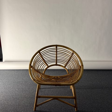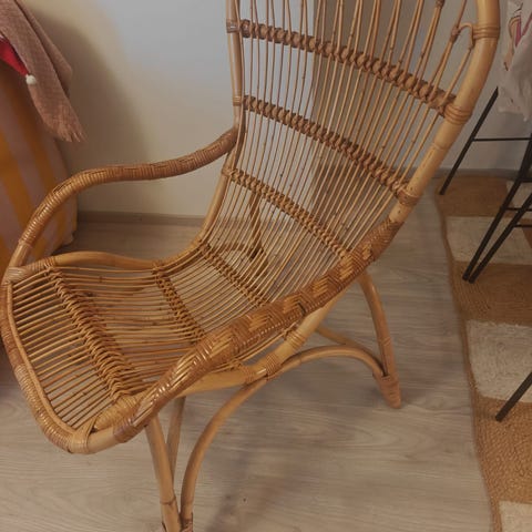 Ikeasta ostettu rottinki nojatuoli tyynyillä.
