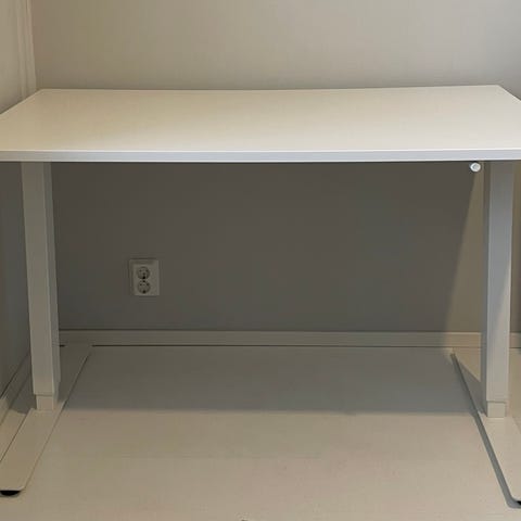 Säädettävä työpöytä, jossa valkoinen suorakulmainen pöytätaso ja valkoinen metallirunko. Myydään uutena ja tarpeettomana. Korkeussäätö 63-90 cm.