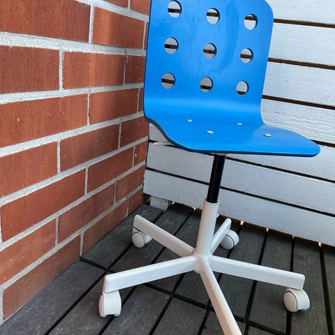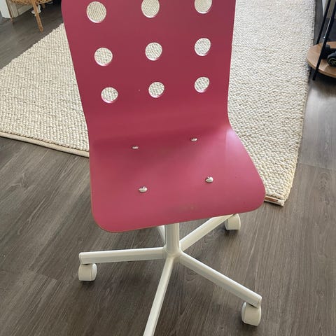 IKEA lasten tuoli, pyörillä varustettu malli. Istuinosassa ja selkänojassa on pyöreät tuuletusaukot. Tuolissa on korkeussäädettävä istuin ja viisisakarainen jalusta pyörillä. Väri vaaleanpunainen, jalusta harmaa. Sopii esimerkiksi lasten työpöydän tai koulupöydän tuoliksi.
