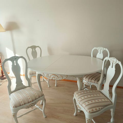 Kruunukalusteen rokokoo sohvapöytä muotoon leikatulla lasilevyllä.