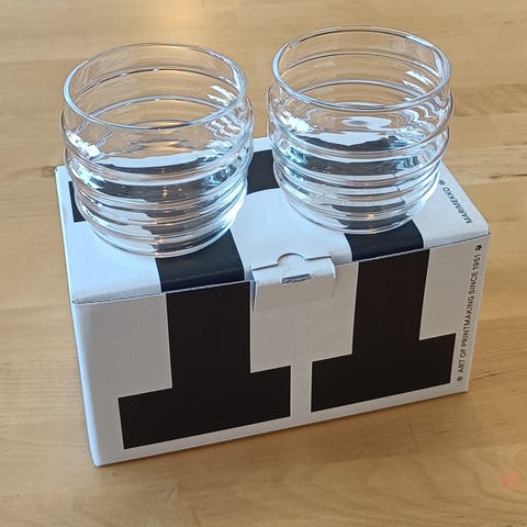 Marimekko sukat makkaralla jalalliset juomalasit. Ruskea lasiosa, tumma violetti jalka ja vihreä alaosa. Toisessa juomalasissa muutama ilmakuplat. Molemmissa laseissa näkyy pohjassa viivat.
