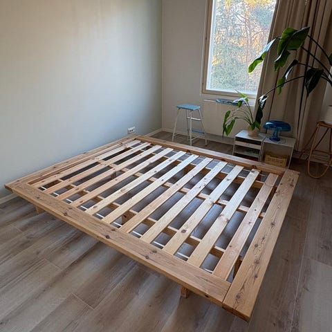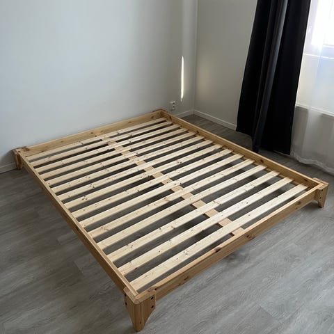 Myyn kuvan Karup Designin sängyn ja siihen kuuluvat valaisimet (saat ledlamput mukaan). Sänky on matala (patja tulee 21 cm korkeudelle maasta), futonpatjalle tarkoitettu sänky, mutta muunkinlainen 160 cm leveä patja käy siihen. Sänkyä kiertää pieni laita ja takana on sen ansiosta säilytystilaa esim. kirjoille, tyynyille, tms. Tyylikäs, esim. japandi-tyyliseen sisustukseen sopiva sänky, jonka voit halutessasi maalata. Ilmoitettu korkeus on sängyn kokonaiskorkeus pääty mukaan lukien.