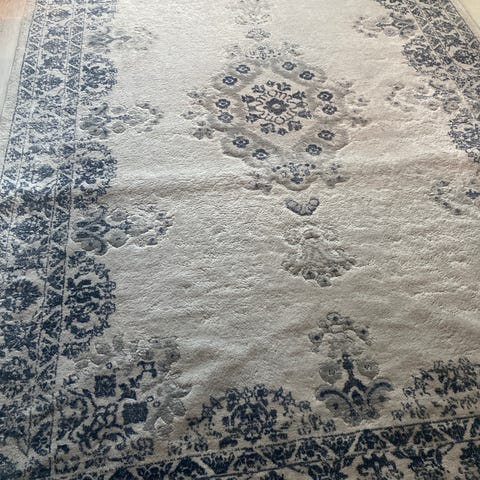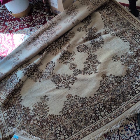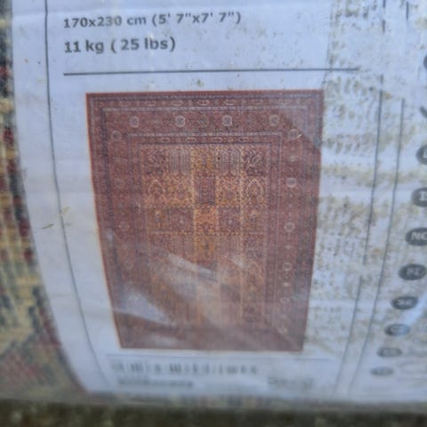 Ikea matto. Kuvissa näkyy rullalle kääritty matto muiden tavaroiden joukossa. Tarkempi koko, materiaali ja väri eivät käy selvästi ilmi kuvista.