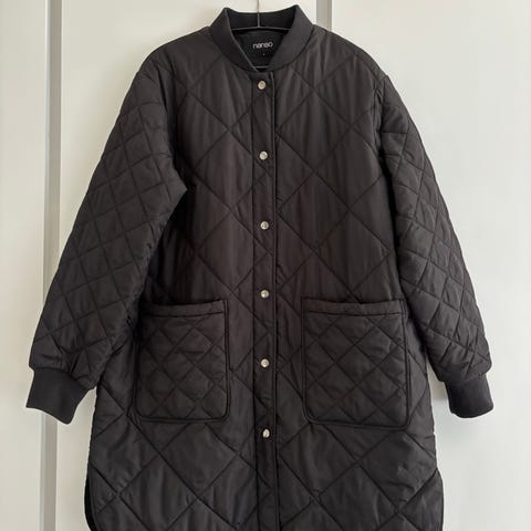 Nanso Maxi-tikkitakki pitkä naisten takki. Koko L. Väri ruskea. Materiaali 100 % polyesteriä, sekä päällinen että vuori. Takissa on tikattu pinta, etutaskut ja etupuolella nappikiinnitys. Sopii käytettäväksi välikausitakkina tai kevyenä päällystakkina arkeen.