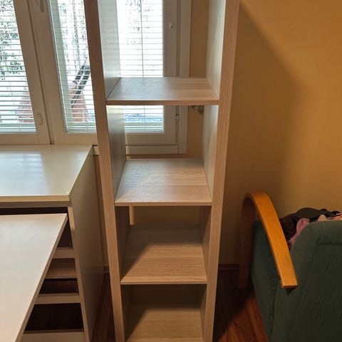 Hyväkuntoinen Ikean hylly ja neljä kankaista laatikkoa. Malli muistaakseni Kallax