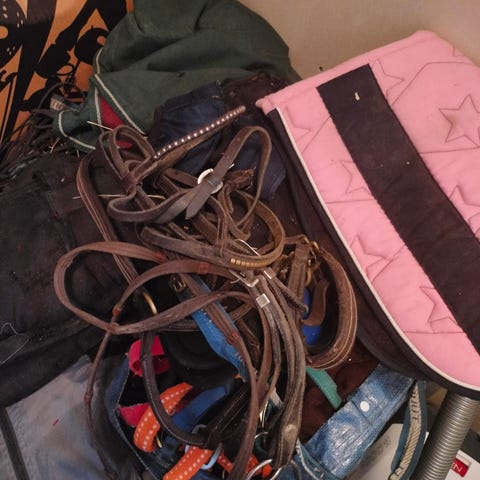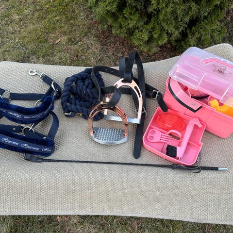 Hevostarvikepakkaus riimulla, taluttimella, jalustimilla ja harjapakkauksella