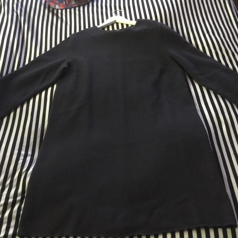 Myydään kaunis Vuokko villamekko (100% villa). Tummansininen, jossa hennosti vaaleammat leveät raidat.