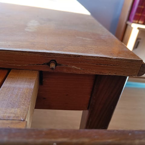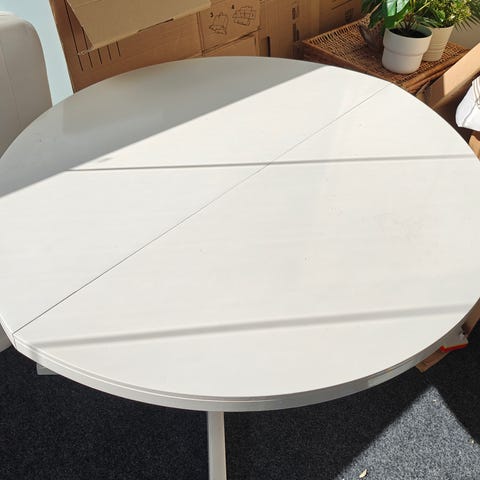 Annetaan puinen pyöreä ruokapöytä. Maalipinta on jo parhaat päivänsä nähnyt. Halkaisija 105 cm.