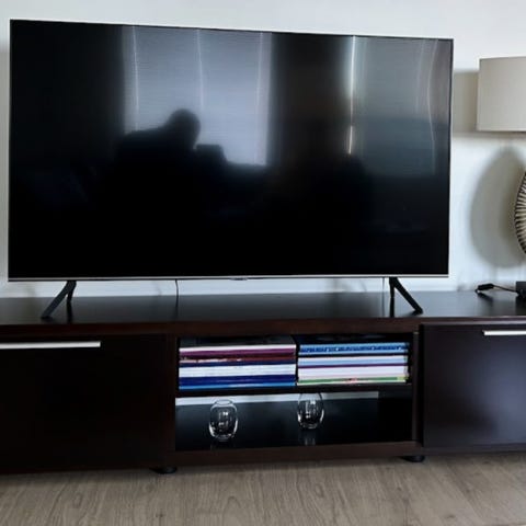 Kierrätettyä massiivipuuta oleva tv taso, ei käytönjälkiä