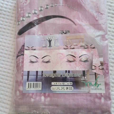 Saana-merkin kertakäyttöistä paperista pöytäliinaa, yksi avaamaton rulla ja vajaa puolikas.