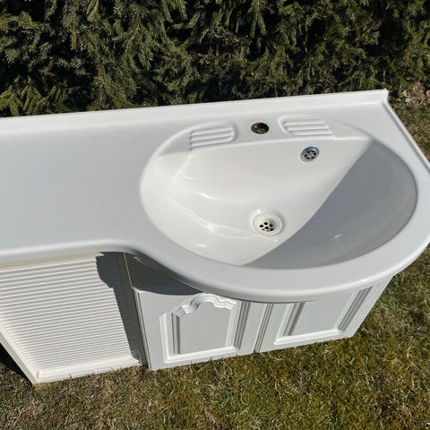 Valkoinen seinäkiinnitteinen kylpyhuoneen allaskaappi, jossa on kaksi etusarjaltaan sileää laatikkoa. Yläosassa on jaoteltu säilytystila useilla lokeroilla, jotka soveltuvat esimerkiksi hygieniatarvikkeiden ja pienten esineiden järjestämiseen. Kaappi on suunniteltu asennettavaksi pesualtaan yhteyteen ja se tarjoaa suljettua säilytystilaa kylpyhuoneeseen. Materiaali on maalattua tai pinnoitettua levyä, pinta on tasainen ja vaalea, mikä sopii monenlaiseen kylpyhuoneen sisustukseen. Allas kuuluu mukaan.