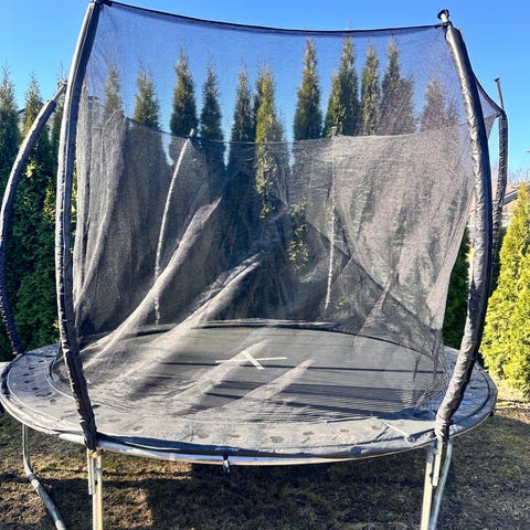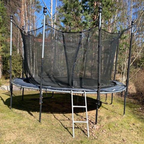 Outran vahva metalllirunköinen trampoliini. Turvaverkossa pari paikattua reikää. Muuten kaikki osat tallessa ja käyttökuntoinen. Trampoliinin halkaisija 3,5 metriä.