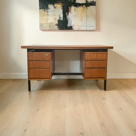 Vintage puinen kirjoituspöytä (ehkä teak ?). Oikealla reunalla vetolaatikot, vasemmalla puiset jalat. Elämää nähnyt, mutta vielä tukeva ja toimiva.