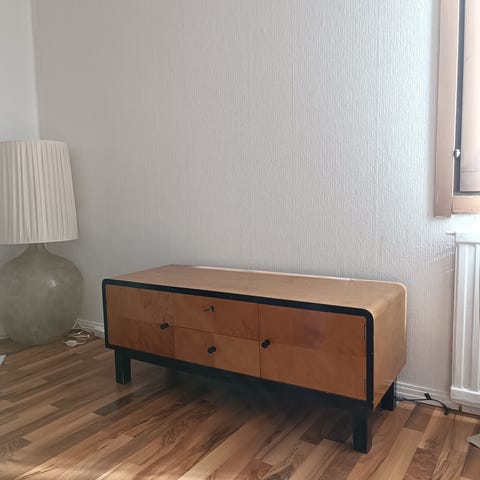 Kulmamallinen kaappi taso. Toiminut meillä tietokonepöytänä mutta toimii myös esim TV tasona. Kaapissa hylly. Erittäin painava. Acasia puuta.