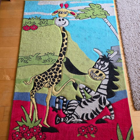 Rugvistan lastenhuoneen nukkamatto, koossa 100x160cm. Ollut käytössä 1,5 vuotta, pesty itse kotona vedellä ja mäntysuovalla pari kertaa. Ehkä sen takia nukka vähän "vanunut", ei ihan pörheimmässä kunnossa enää. Saa tutkia ennen ostopäätöstä :)