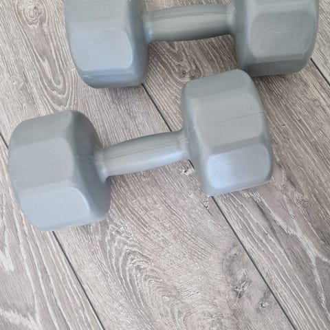 Kuvassa näkyvät käsipainot, voimapyörä ja lihashuoltorulla
