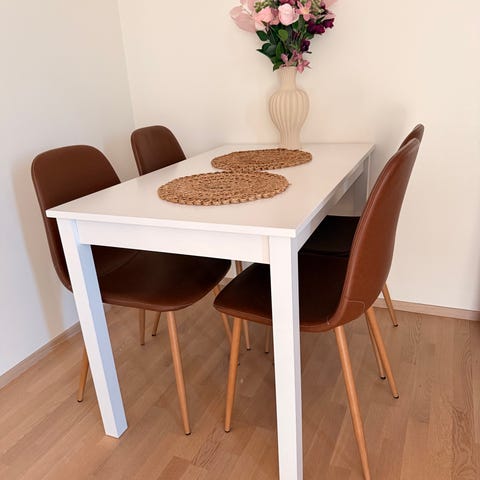 Valkoiseksi maalattu ruokapöytä. Ehjä ja tukeva, mutta maalissa moitteita (kuva).