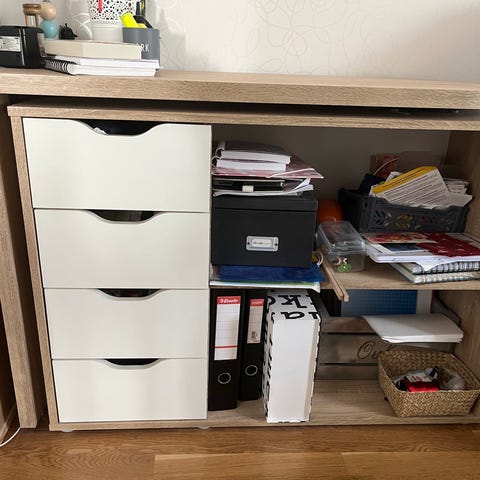 Työpöytä, tuoli, lipasto ja hyllykkö/tv-taso