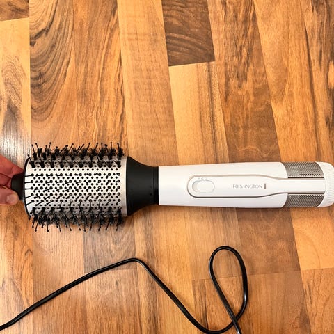 Vähän käytetty Remington lämpöharja hiustenmuotoiluun. Sylinterimäinen harjapää, jossa muoviset piikit ja ilmanläpäisyaukot föönausta ja muotoilua varten. Soveltuu hiusten kuivaamiseen ja muotoiluun samanaikaisesti. Johto- ja verkkovirtakäyttöinen laite kotikäyttöön.