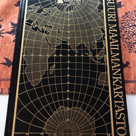 Karttakirja kivoilla kuvituksilla, alakoululaiselle kiva tapa opetella maantietoa/ avuksi koulun ohelle.