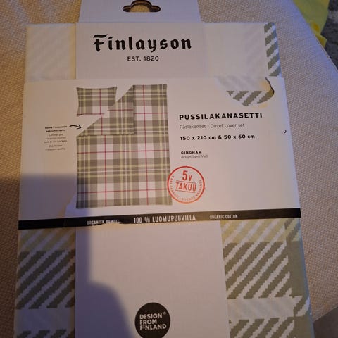 Finlayson yhden hengen pussilakana ja tyynyliina. Monivärinen ja kuviollinen. 100% puuvillaa. Tyynyliinassa haalistumaa, muutoin hyväkuntoinen setti.