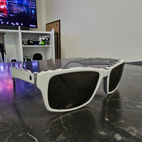 Hoye aurinkolasit unisex-käyttöön. Kehys on valkoinen ja muovia, linssit tummat. Mallissa on leveät sangat ja kaareva muoto, joka peittää silmät hyvin sivuilta. Sopivat yleiseen arki- ja vapaa-ajan käyttöön eri sääolosuhteissa. Mukana kovakotelo kuvien mukaisesti